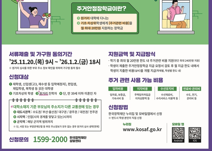 특히 원거리 통학 여부가 주요 요건으로 심사되기 때문에, 부모의 주민등록 주소지와 대학 소재지 간의 거리 확인이 핵심입니다. 서류제출 기간이 시작되었습니다. 2026년 1월 2일 까지 접수하면 신청 가능합니다.
