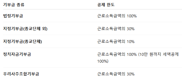아래는 기부금별 공제 한도를 한눈에 정리한 표입니다.