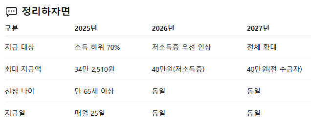 2단계(2027년): 전체 기초연금 수급자에게 월 40만원 확대 지급